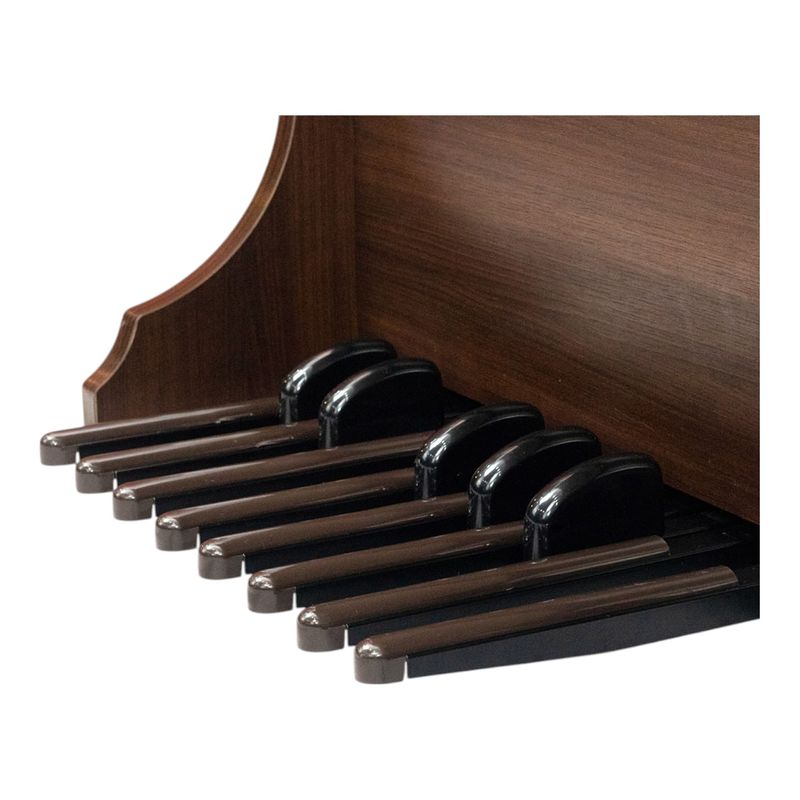 Outro grande destaque está na versatilidade de timbres: são 160 sons prontos que podem ser combinados em até seis simultâneos entre os teclados e pedaleira. Os 40 ritmos com acompanhamento automático, metrônomo com timbre de voz, e kits de bateria completam a experiência musical. O órgão também reproduz arquivos MP3 via USB com controle de volume dedicado, tornando-o ideal para treinos, playback e apresentações. A presença de conexões variadas como AUDIO IN/OUT, AUX, PHONE e pedal de expressão com switch para controle rápido de funções reforça sua usabilidade e controle em tempo real.