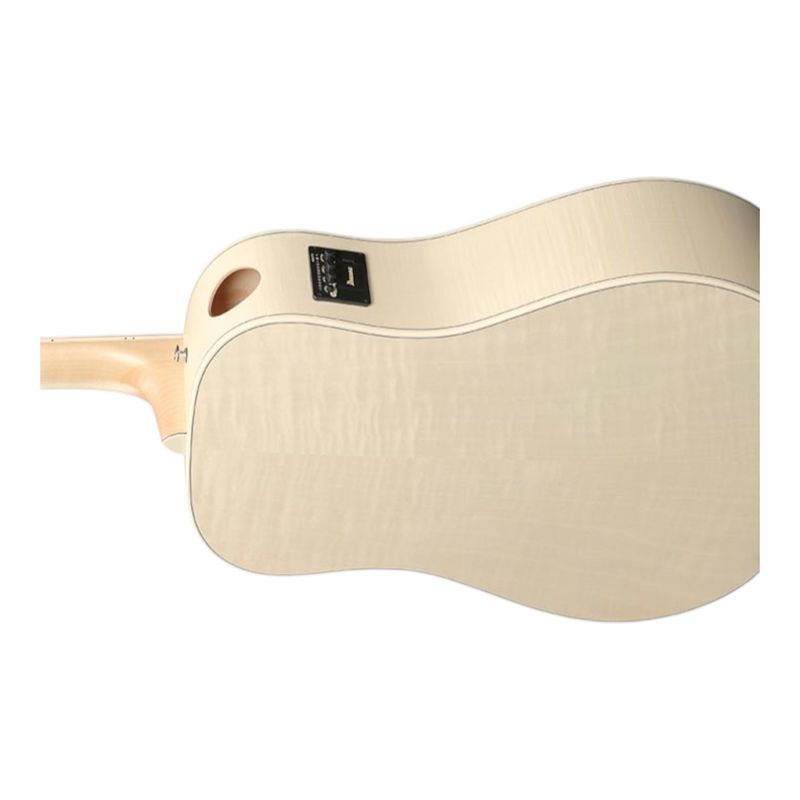 O Ibanez AAD77M1E apresenta o formato Grand Dreadnought, desenvolvido para oferecer maior projeção, graves encorpados e ampla resposta dinâmica. Com corpo aproximadamente 5% maior que o dreadnought tradicional, proporciona mais volume e riqueza sonora, mantendo conforto ergonômico. O tampo sólido em Sitka Spruce entrega grande alcance de frequências, com agudos brilhantes, médios definidos e graves profundos, enquanto o fundo e laterais em Flamed Maple acrescentam brilho e definição ao timbre.